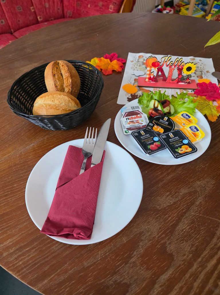1 Brötchen, 1 süßer Aufstrich, 1 Butter und 1 Getränk (Milch, Kakao oder Kindercappuccino)